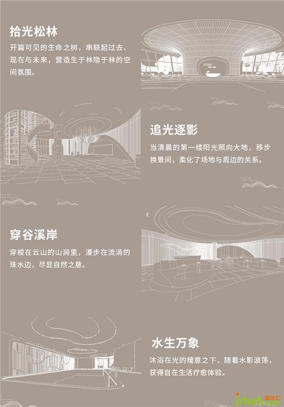 設計試圖通過對自然形態(tài)重新拆解、抽象和再定義,在光的相遇,云的漫不經心,水的靈動,樹的溫潤,將室內室外的邊界打破,建造人居生活的詩與遠方。