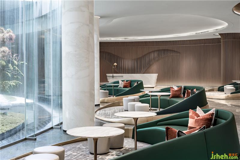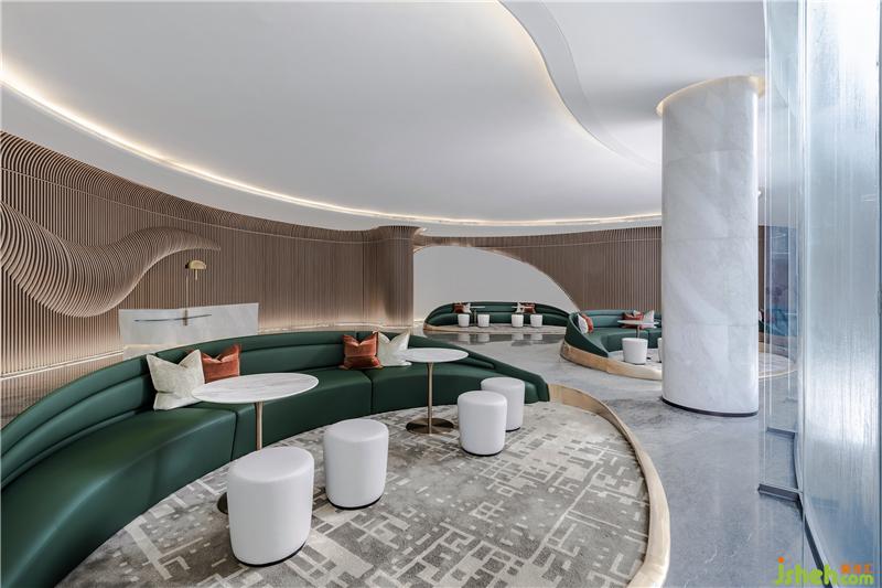 延續(xù)“穿谷溪岸”的靈動基調(diào),空間環(huán)抱式的綠植墻引入室內(nèi),不僅是形式的陳設美感,更多的是通過視覺美表達它與整體空間的線條。
