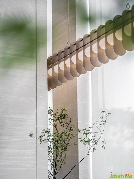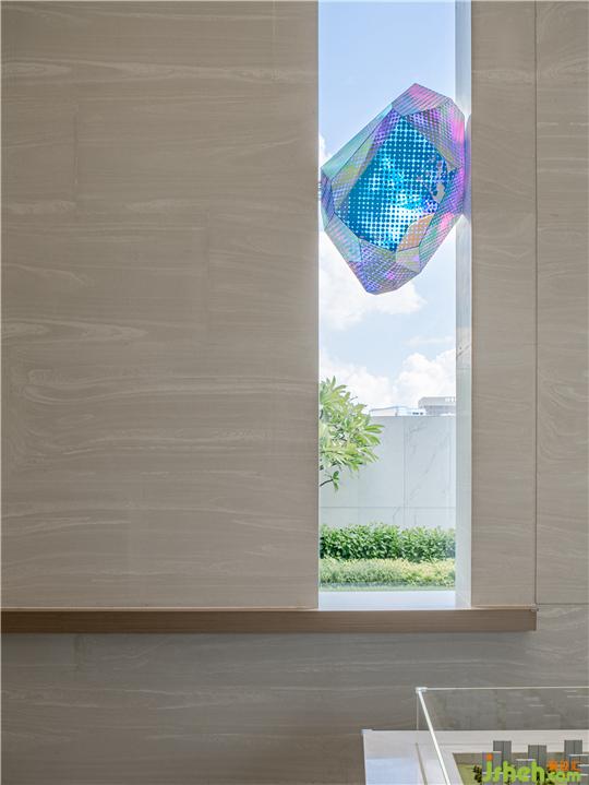 在解構(gòu)的空間中,適宜的墻體鏤空處理,安放如蠶蛹般的霞光溢彩輝映半空,似乎靜默一場(chǎng)新生,展現(xiàn)蝴蝶以破繭而出的力量。