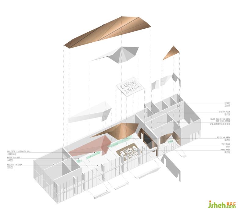 山脈與礦石共有的切割折線元素,幻化為空間的幾何語言,配合空間游移的功能轉(zhuǎn)換,售樓處設(shè)計形成傳承性與社交性兼容的展示空間。