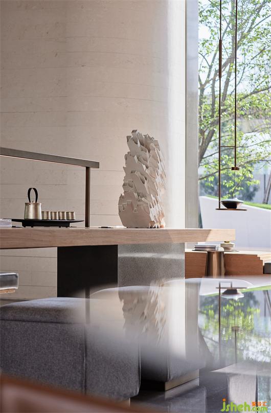 銷售中心設(shè)計(jì)師在接待大廳的原建筑基礎(chǔ)上延伸了“書脊”造型,讓書卷氣油然而生。紙可塑性極高,成為設(shè)計(jì)探索創(chuàng)新的關(guān)鍵材料。于此,設(shè)計(jì)師取日本特殊“和紙”材質(zhì)構(gòu)建紙網(wǎng)概念,在水吧區(qū)后方形成虛實(shí)相生的屏風(fēng),光影交錯(cuò)。