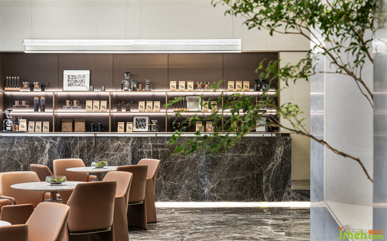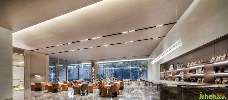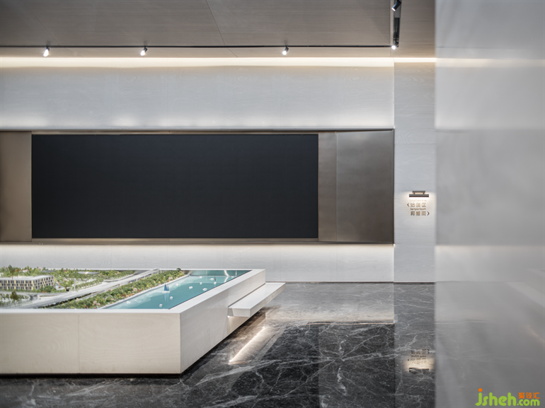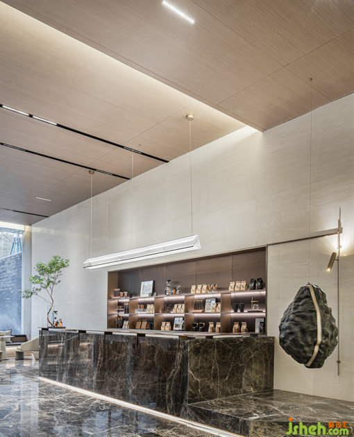 木飾面、大理石等材料被大范圍地運用在空間中,售樓部設(shè)計溫潤的材質(zhì)消弭了邊界,濃烈且寂靜的自然氣息由內(nèi)而外,漫溢而出。