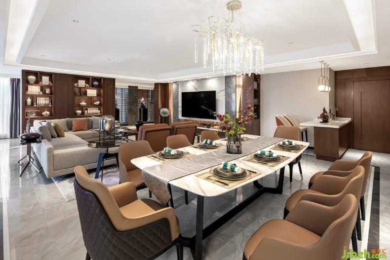 空間劃分過(guò)程中,各功能區(qū)呈遞進(jìn)式布局。開(kāi)放式客廳、餐廳、茶室、休閑區(qū)、吧臺(tái)都被容納到同一個(gè)生活場(chǎng)景;室內(nèi)設(shè)計(jì)師以及利用木墻隔斷將茶室、休閑區(qū)間隔開(kāi),視覺(jué)上形成“一室多用,互不干擾”的效果,同時(shí)維系各個(gè)功能區(qū)域的秩序,增強(qiáng)空間層次感。