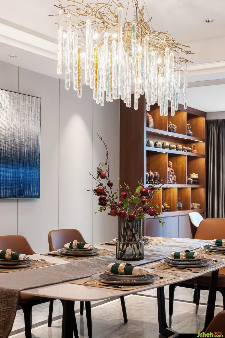 餐廳設(shè)計(jì)為避免視覺(jué)雜亂,只保留了清晰素凈的元素。室內(nèi)設(shè)計(jì)師藝術(shù)燈飾與背景墻畫(huà)在簡(jiǎn)約氣質(zhì)下,給人寧?kù)o安逸的質(zhì)感。
