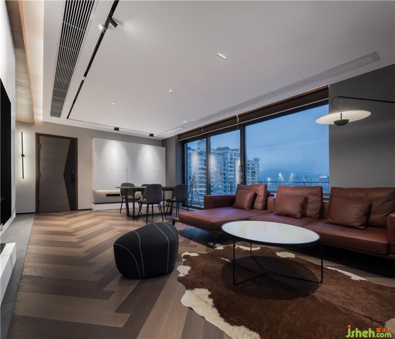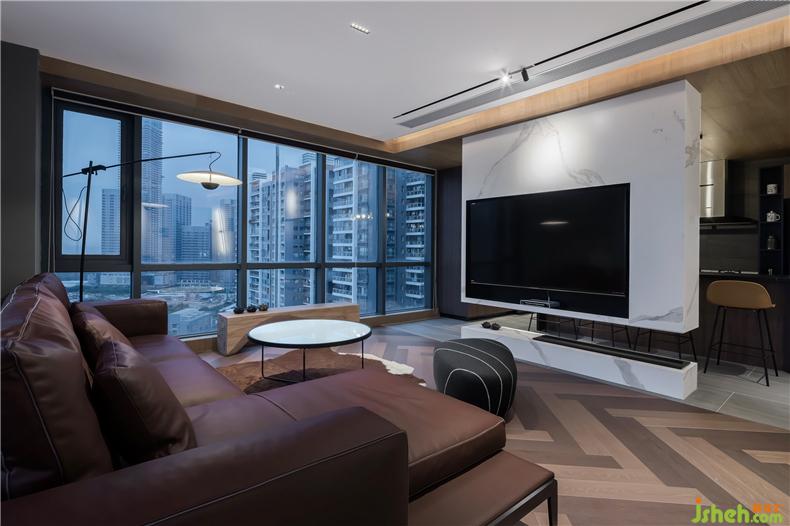 一層主要集中在對(duì)開放式公共區(qū)域的空間布置規(guī)劃,室內(nèi)設(shè)計(jì)師并利用原木色與白色,將餐廳與客廳通過上下色感與紋理反差,半隔斷式大理石電視背景墻區(qū)分開。180°落地窗讓城市景觀與晝夜之間變幻的自然光線落入屋內(nèi),讓人享受在大城市里愜意、輕慢、舒暖的生活節(jié)奏。