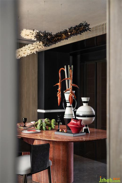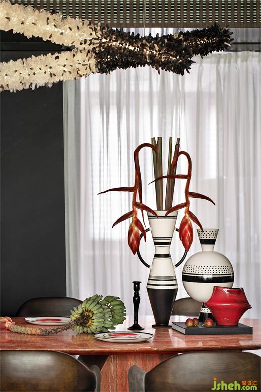 意大利ROMETTI品牌瓷器,黑白相間的幾何美感,與紅色系花藝熱烈、張揚(yáng)的生命力糅合。