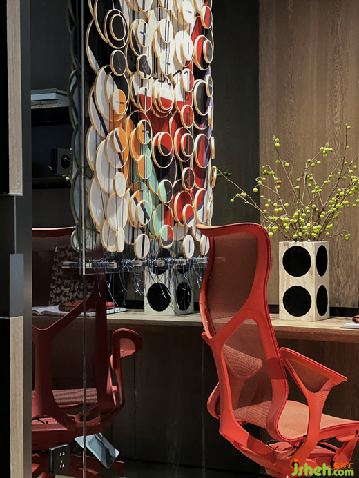 “義烏紅”、蜂蜜黃、薄荷綠、墨黑、淺灰色塊,囿于一個(gè)個(gè)圓形之中,被解構(gòu)為一幅抽象寫意的藝術(shù)裝置。