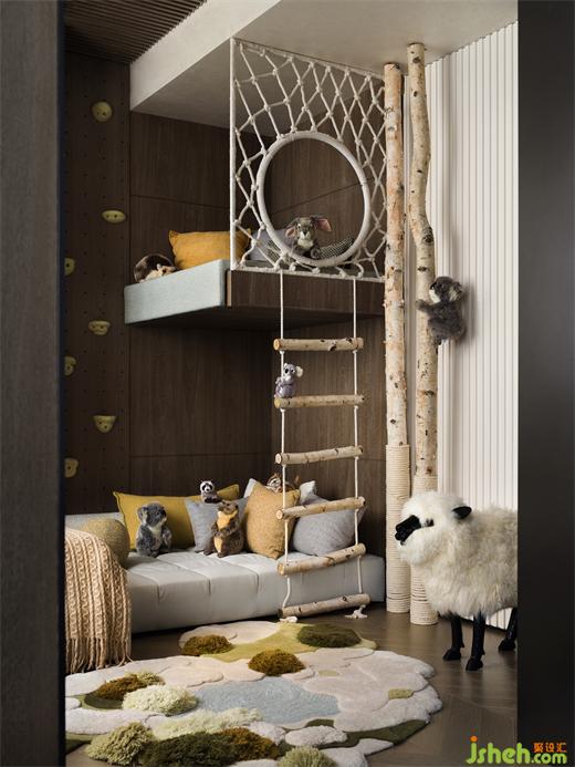 用地毯模擬森林的植被,而小羊咩咩、考拉懶懶成為空間的守護(hù)者,樣板房設(shè)計師將自然搬進(jìn)兒童房,為小朋友編織夢想。
