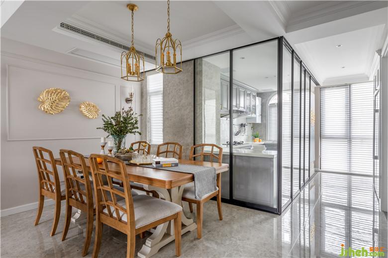 一層的縱深很大,原戶(hù)型實(shí)墻阻隔了來(lái)自廚房的光線,使得位于中部的餐廳陷入暗淡無(wú)光的困境。因此室內(nèi)設(shè)計(jì)師采用多聯(lián)動(dòng)玻璃移門(mén),讓兩邊的陽(yáng)光成功牽手,整個(gè)家也變得通透起來(lái)。