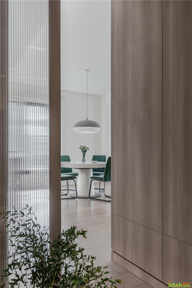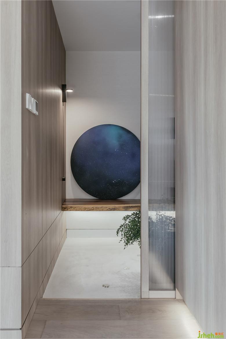 玄關(guān)的長虹玻璃移門后面是玄關(guān)收納,衣服、鞋子、包包都可以在進門時隨手放好。地坪拐彎處和室內(nèi)地板其實有一個微小的落差,避免塵土帶進家中。