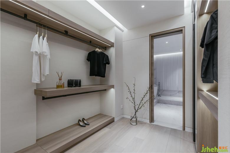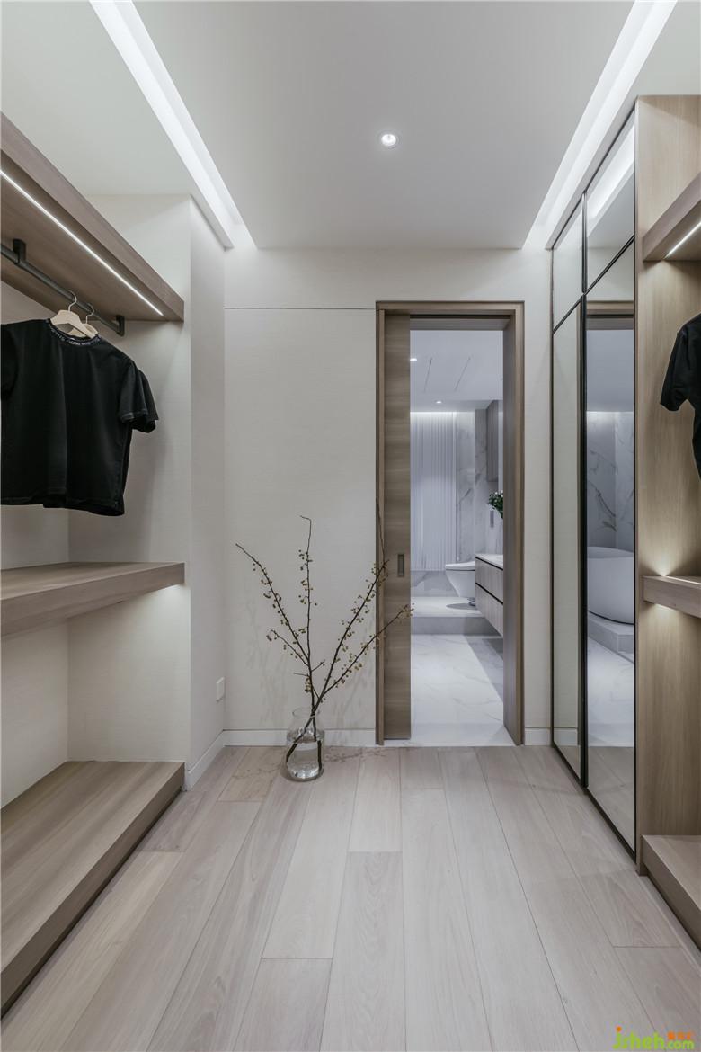 三恒設(shè)備讓家里可以無憂地擁有開放式超大衣帽間。頂面線性&點光源、層板內(nèi)嵌燈條的設(shè)計,開放與封閉結(jié)合。純色黑白灰衣物、鞋包掛放在這里,井井有條,干練利落,構(gòu)成了屬于主人的空間秩序,創(chuàng)造生活品質(zhì)。