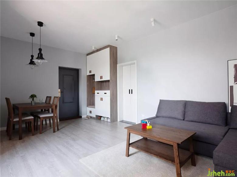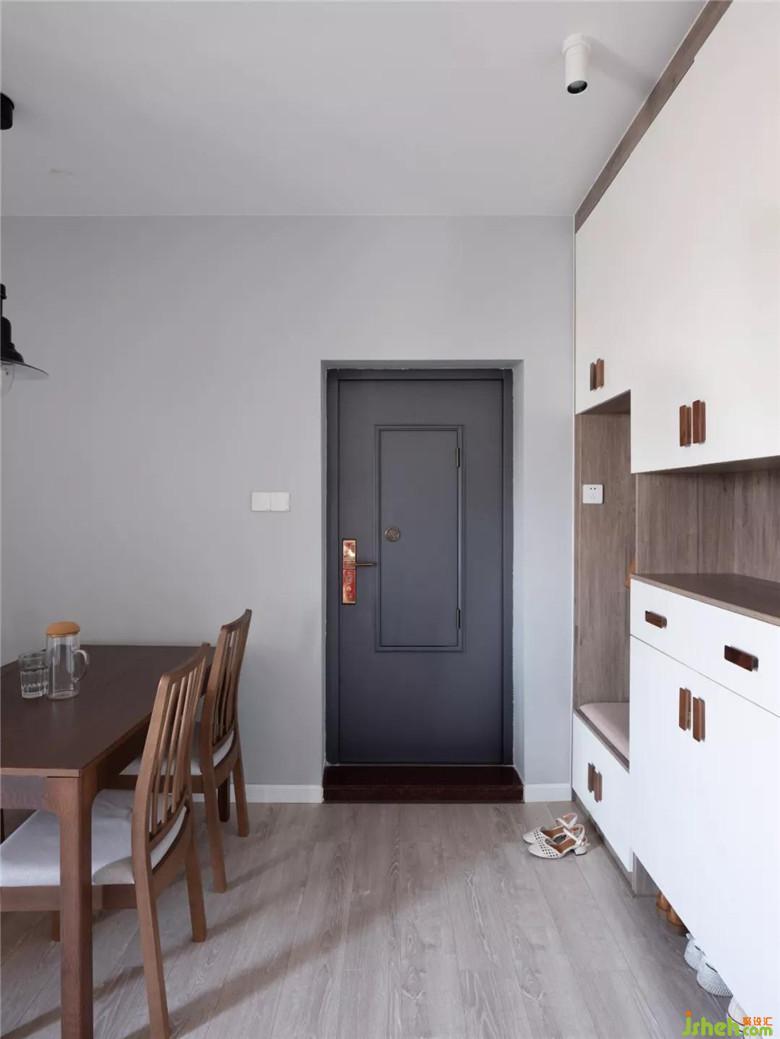 客廳的一旁劃分了用餐區(qū)域,餐廳頂部的燈泡吊燈,在簡(jiǎn)單空間里做復(fù)古點(diǎn)綴,設(shè)計(jì)師通過清漆和裝設(shè)環(huán)保板的方式,使柜子改頭換面,白色和原木色相間的柜子,既是收納空間,又是一個(gè)入門玄關(guān),可以放置鞋帽,白色柜子的點(diǎn)綴讓極簡(jiǎn)的空間多了一絲輕盈。