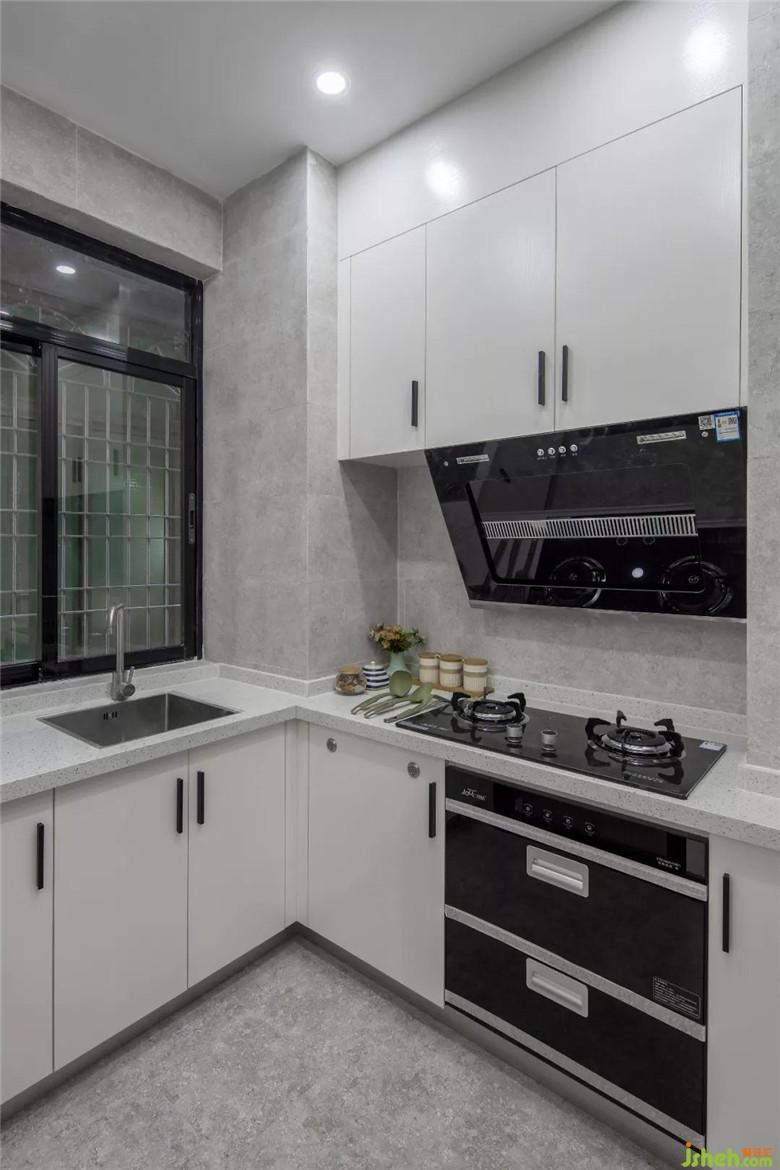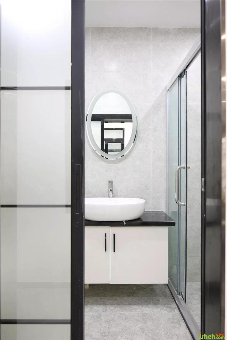墻面與地面采用統(tǒng)壹地磚,在視覺上延伸了作用,減少了空間局促感。定制收納柜子,更好的貼合空間需求,而且上不到頂+下不到地的設(shè)計,不僅是為了美觀考慮,更多的還是為了減少擁擠感。
