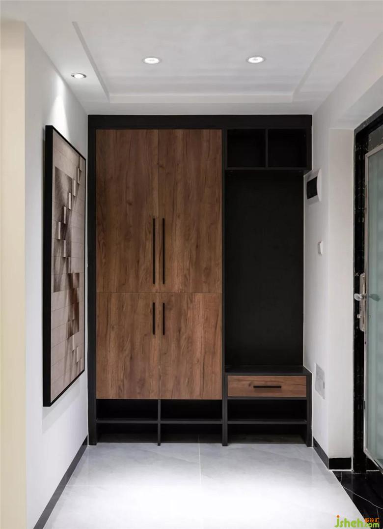 入門處的玄關氣質典雅,抽象的掛畫在3㎡的空間里,氣韻低調奢華;原先的玄關鞋柜設計老舊,改造后的玄關增加1586mm定制柜,柜面的木頭紋理,樸實而細膩,柜子不但沒有遵循常規(guī)鞋柜設計,還結合生活行為設置方便穿鞋的地方。裝修設計