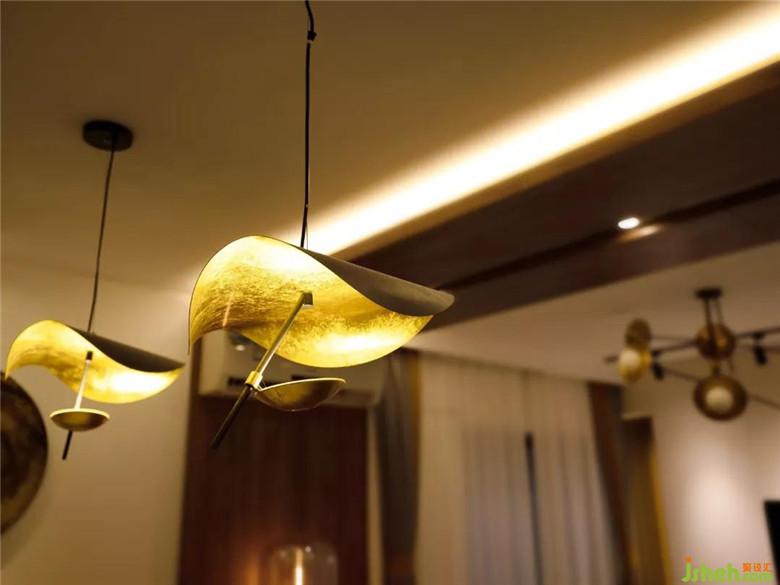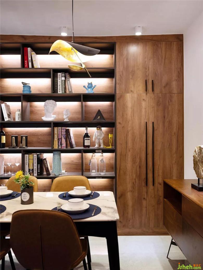 餐廳和客廳在同一空間,卻不顯突兀。客廳與餐廳天花中間的木質吊頂,讓客餐廳功能區(qū)分更加清晰。餐桌上方的燈是業(yè)主淘回來的復古吊燈,金屬的銅片,暖黃的燈光,是一份歸家的安心。設計師新設計了木質紋理的置物架,打造充滿質感的落地書架,可以放置書籍和業(yè)主從世界各地淘回來的展示品。裝修設計