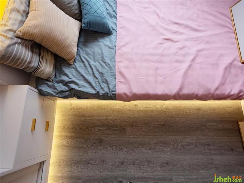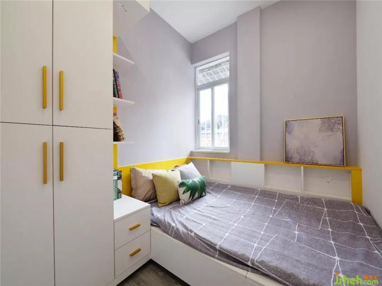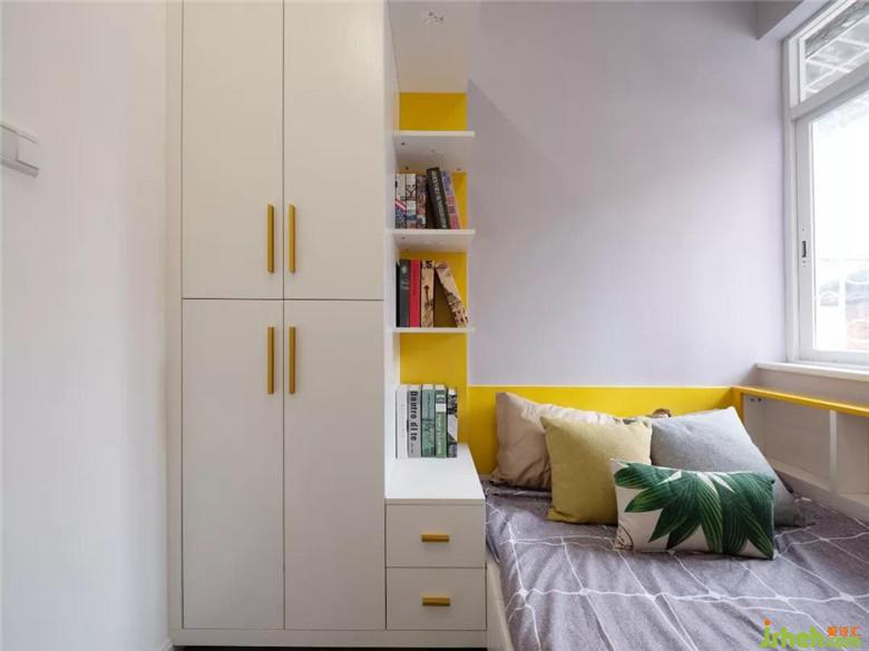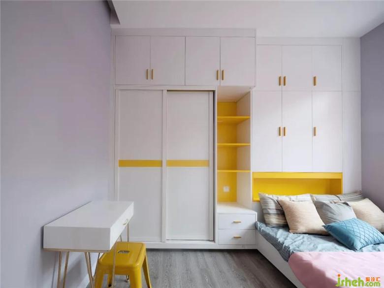 臥室選用實木地板,延續(xù)溫潤遐邇,令空間質(zhì)感更為飽滿。衣柜壁櫥大面積的白色主調(diào),點綴一抹亮黃色,顯得臥室清新明亮,個性簡約。定制的柜櫥滿足了戶主收納的需求,收納與簡約創(chuàng)造出專屬個性,定制的形式讓衣柜和墻體的尺寸落得剛剛好