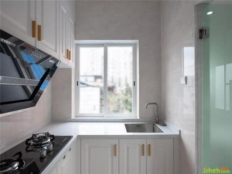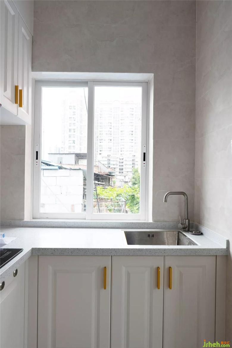 改造前廚房墻體受潮脫落的情況嚴重,設計師推翻了舊廚房的地磚墻磚和灶臺,重新因地制宜設計了L型廚房,白色的壁櫥和櫥柜,典雅清新,大理石暗紋墻磚高雅簡約;設計師設計了兩道玻璃門銜接旋轉(zhuǎn)樓梯和衛(wèi)生間,幾平米的空間里合理布局,流暢銜接,完全沒有狹窄擁擠的感覺。