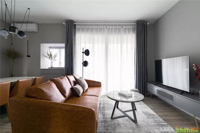 客廳整體是淺灰色系,選擇棕色皮質(zhì)的沙發(fā),以此為中心,打造一個小而精致的交流空間。在灰色調(diào)的墻面、窗簾與抱枕中,沙發(fā)顏色極具跳脫性,使整個空間更具立體感和層次性。室內(nèi)設(shè)計師