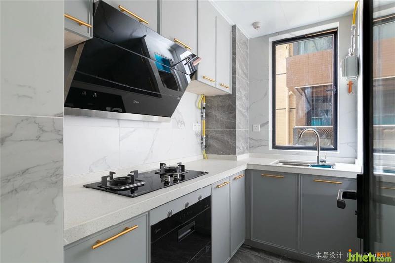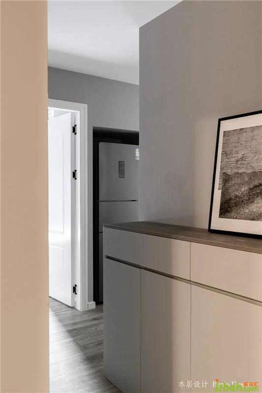 廚房面積太小,沒(méi)有放置冰箱的位置。利用原戶(hù)型的房間入門(mén)處,進(jìn)行局部的墻體改造,改變房間的入門(mén)位置,將冰箱移至原入門(mén)處。室內(nèi)設(shè)計(jì)師