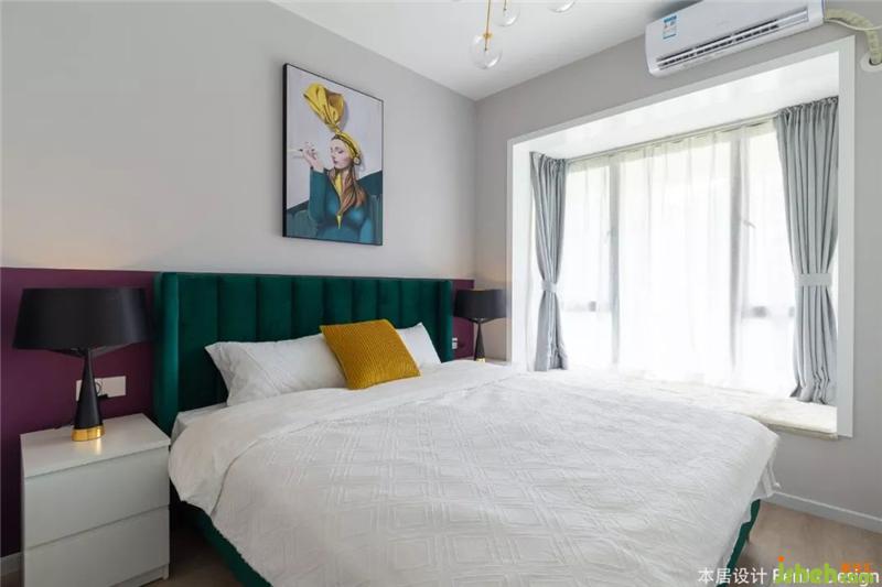 墨綠色的床頭,摩登的插畫,讓臥室的風格與客廳截然不同。