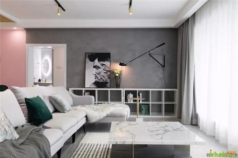 客廳整體以白色為基底,局部采用中性灰色水泥進(jìn)行搭配,黑色金屬的壁燈以點(diǎn)綴。為了視覺上的協(xié)調(diào),落地書柜配合沙發(fā)的高度,在沙發(fā)坐著就能找到自己要看的書。室內(nèi)設(shè)計(jì)師