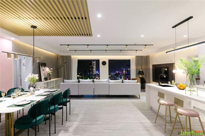 客廳舍棄了笨重的大吊燈,安裝了兩排軌道射燈,暖色調(diào)的燈光,讓整個(gè)空間顯得更加溫馨??蛷d的沙發(fā)沒有按照傳統(tǒng)布局朝向電視柜方向擺放,而是面向落地窗,橫向的布局不盡寬廣大氣,且提高了觀賞性,福田CBD的夜景盡收眼底。