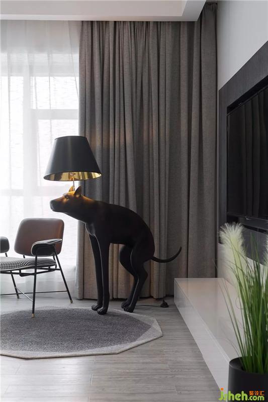 L型的淺色系沙發(fā),符合民宿客廳用途,五六個(gè)人同時(shí)坐著也不會(huì)用擁擠,指不定還能來個(gè)[葛優(yōu)癱]。相框式的電視墻,獨(dú)特的狗狗雕塑落地?zé)艉徒饘俚鯚?,為客廳增添了質(zhì)感。大理石的茶幾,灰色調(diào)的窗簾,整體風(fēng)格色系保持統(tǒng)一。