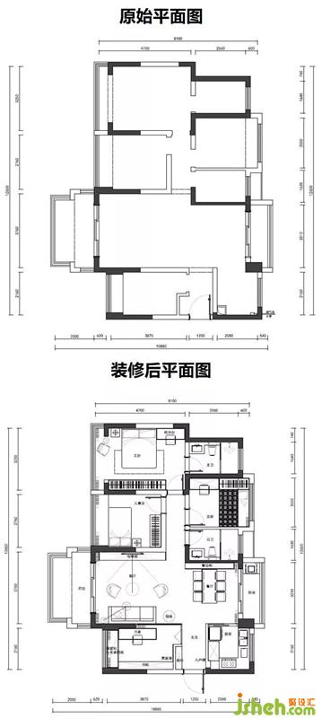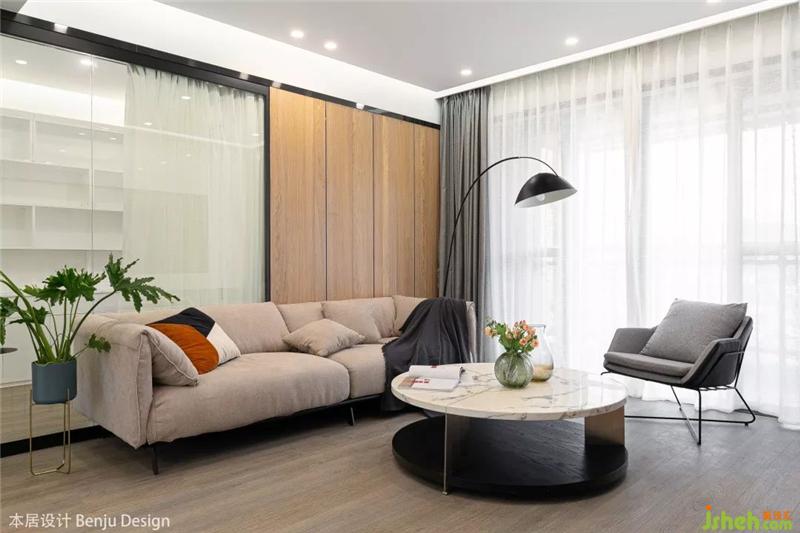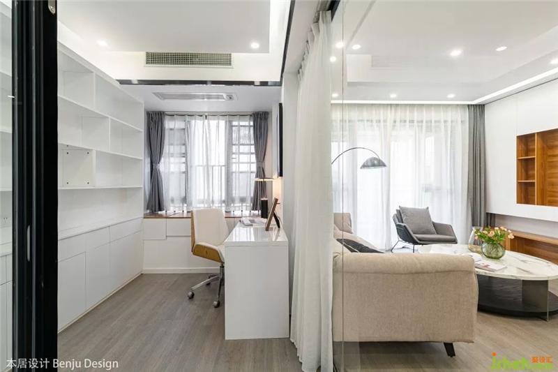 在戶型設(shè)計方面,這次并沒有太大的改動,只是將客廳與書房之間的隔墻打掉,直接改成了玻璃隔斷,增加了整個空間的通透感。室內(nèi)設(shè)計師