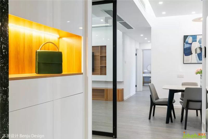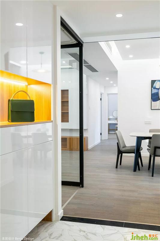 入戶玄關(guān)處,定制了白色+原木配色的鞋柜,我們統(tǒng)計了夫妻倆具體的鞋子數(shù)量、種類,以此來劃分鞋柜內(nèi)的隔層大小高度,完全符合住戶的生活習(xí)慣。鞋柜還設(shè)計了開放格,進門后隨手放包,出門前再也不會忘記帶鑰匙啦。