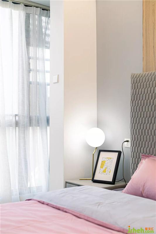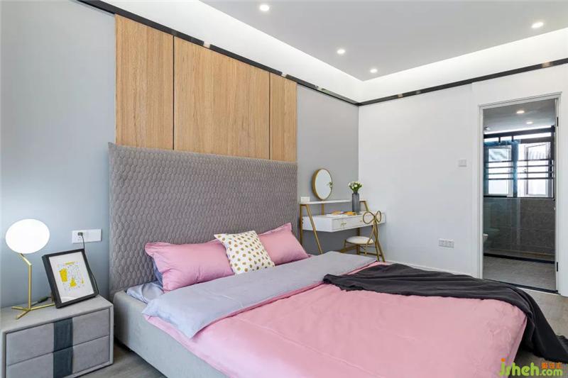 整個主臥的空間顯得非常的通透和明亮,擺放一張1.8m的大床后依然絲毫不覺得擁擠,床頭的背景墻設計沿用了客廳與書房隔墻的設計,保持統(tǒng)一的內外風格。右邊則直接用化妝臺代替了床頭柜,順便提一下,這個化妝椅的設計,簡直是一眼就擊中了老夫的少女心,果斷拿下。