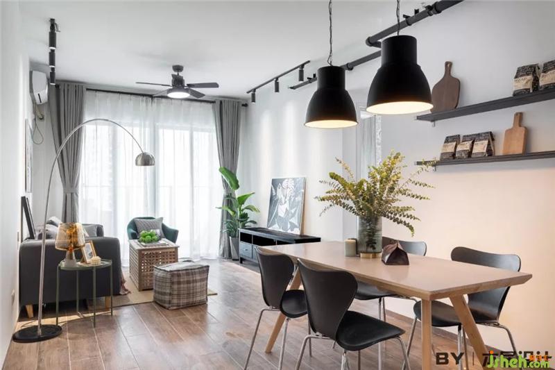 在客廳延伸到餐廳的墻面上,因為層高原因不想再加吊頂,所以我們干脆將無法隱藏的管線大大方方的外露出來,簡單的刷上黑漆,個性的工業(yè)風元素就被毫無違和感的加入了這個空間中。