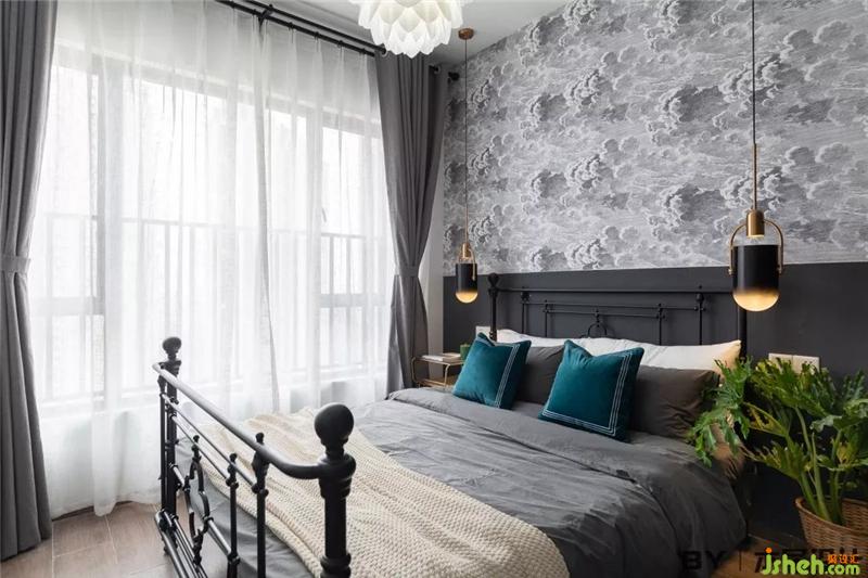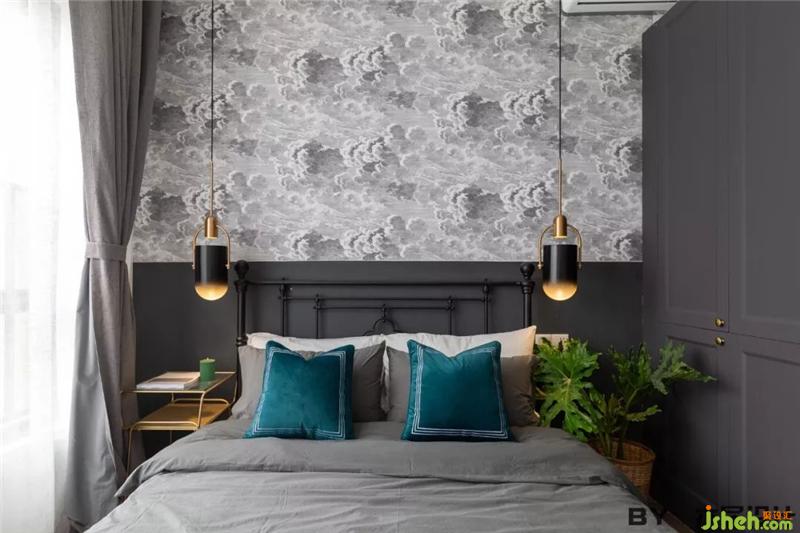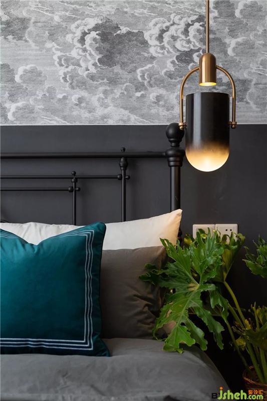 主臥的雙人床也是選擇了黑色鐵架的款式,床頭煙熏燈的效果簡直美到不行。在完成以前,我們曾經(jīng)也偷偷的懷疑過在主臥這么大面積的刷上黑色漆,是否會顯得壓抑。但整個項目完成后的效果簡直讓人驚嘆,墻面腰線以上的壁紙,非常大膽的選用灰色系烏云的圖案,和黑色的墻面相得益彰,藝術(shù)感和美貌并存。室內(nèi)設(shè)計師