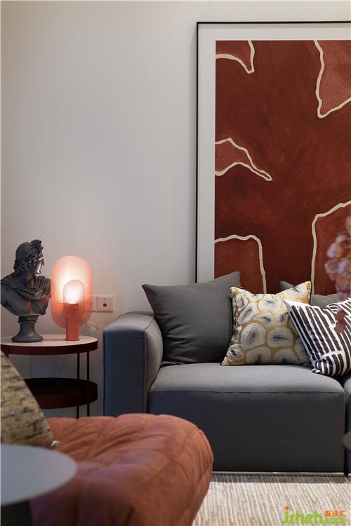 客廳的整體色調(diào)以白色+灰色為主,誠然在華潤城黑白極簡的硬裝基礎(chǔ)上,室內(nèi)設(shè)計(jì)師需要為它注入鮮活的色彩,所以在空間中的軟飾,我們用了大量的紅色來點(diǎn)綴。在視覺焦點(diǎn)的沙發(fā)區(qū)域,用大幅的掛畫來營造視覺的沖擊感,以及塑造空間的藝術(shù)感。