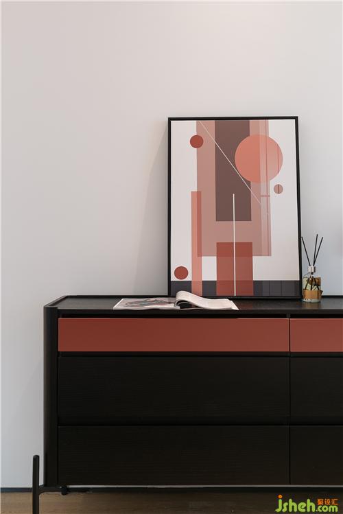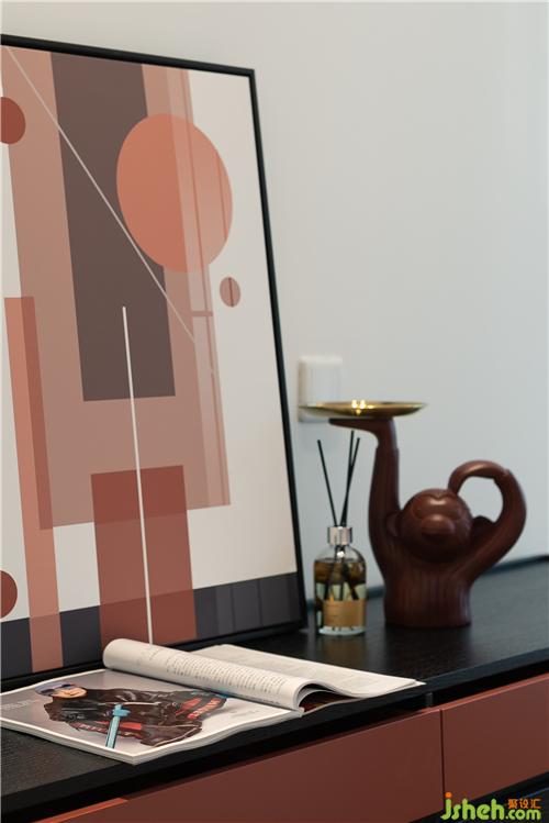 室內(nèi)設(shè)計(jì)師非常注重空間的互動(dòng),床尾的置物柜上選擇紅色抽象幾何掛畫,與床頭的紋理掛畫呼應(yīng),仿真動(dòng)物的擺件及裝飾用品,讓臥室整體氛圍雅致而溫暖。