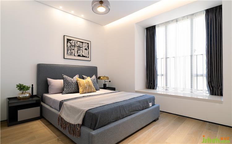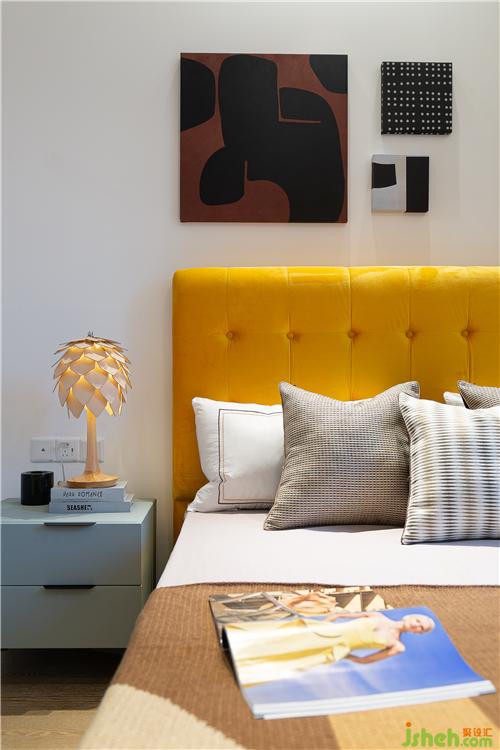 整體白色墻面和柜體,搭配深灰藍(lán)色的床品,經(jīng)典而通透的色調(diào)展現(xiàn)出一份優(yōu)雅與閑適。黃色抱枕,帶入一份溫馨,與藍(lán)白交疊出一份悠然與恣意。