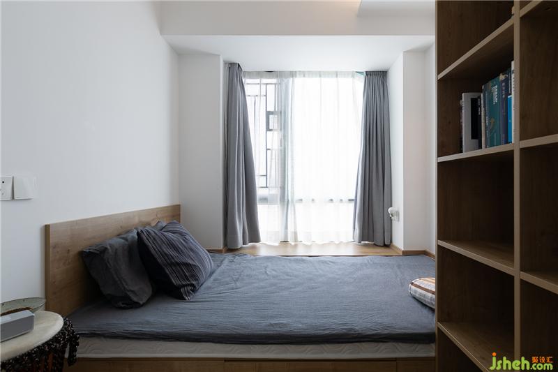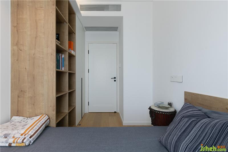 ▼被占用了一小部分空間的次臥,雖然面積不大,但溫馨感十足。和衣柜連接的開放格書柜,同樣是滿足“隨處可取書”的要求,而灰藍(lán)色床品與木色柜體的搭配,也更彰顯著成熟與穩(wěn)重。
