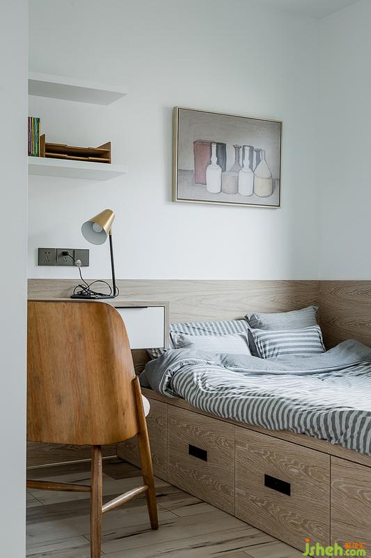 次臥室設(shè)計(jì)公司采取榻榻米形式,整體柜體和書桌現(xiàn)場木工制作,面貼KD板,一大排抽屜是比較實(shí)用的,可以放很多書籍,衣服等。