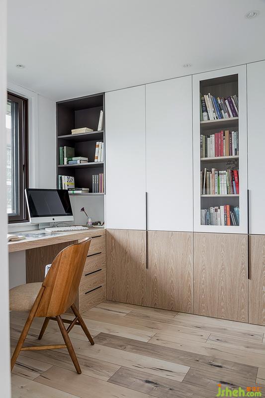 書桌和柜子柜門都現(xiàn)場做,這樣統(tǒng)一性就很高,統(tǒng)一好就能達到干凈感覺。