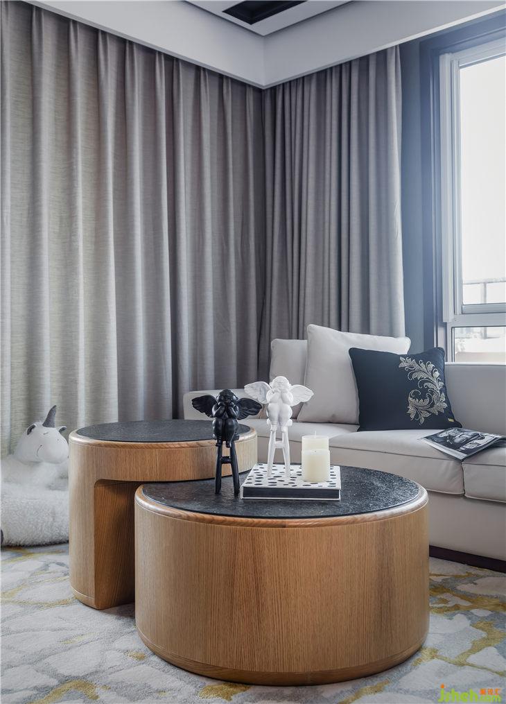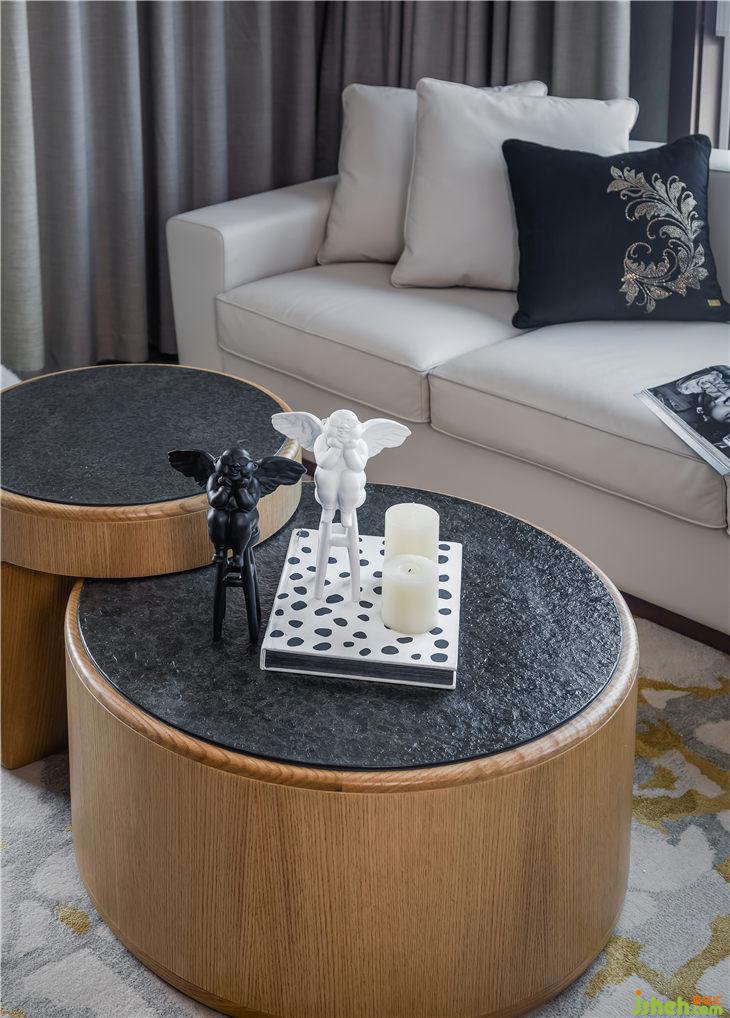 主要材料:藍(lán)色妖姬大理石 、黑白根大理石 、胡桃木色面板、無(wú)紡布壁畫(huà)、棉麻布料等