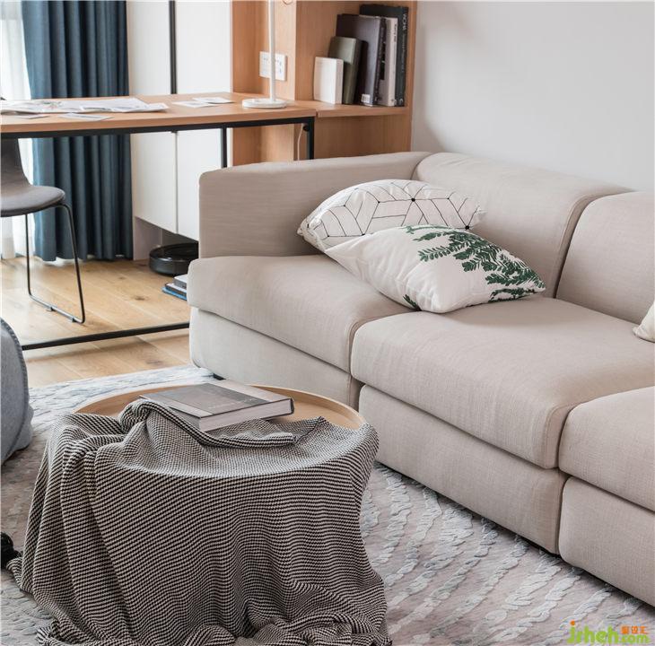 整體色彩上面以文藝白為基調(diào),搭配地面原木色的木紋磚,灰色布藝沙發(fā),整排的書架,白色在整個空間內(nèi)一點也不無聊,硬軟裝的結(jié)合,流露出簡約的美感。