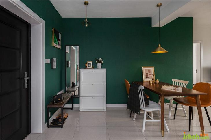 原先餐廳部分吊頂和燈帶拆除。換成小吊燈和明裝射燈的形式。從玄關(guān)到客廳都采用了杜松子綠墻紙使在視覺上有很好的延伸感與整體感。