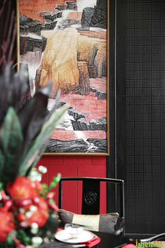 過(guò)廳,一抹明妍的鮮紅映入眼眸。絨線穿落其間的壁掛前,一張宋時(shí)簡(jiǎn)椅,兩盞明式紙燈,朱紅與縞白互映,在細(xì)語(yǔ)交流中,空間更增添幾分東方古韻。設(shè)計(jì)公司