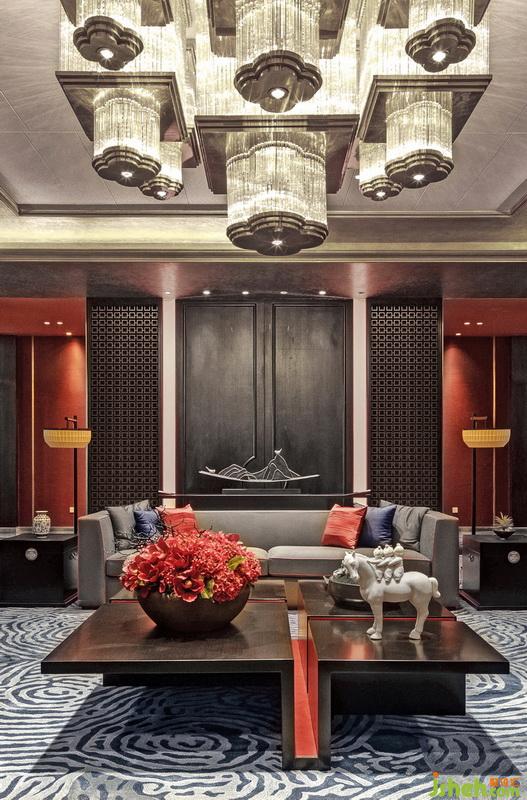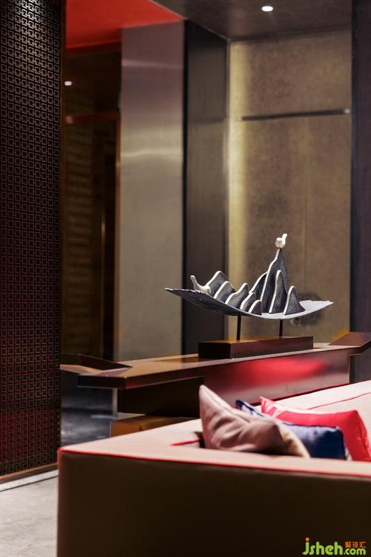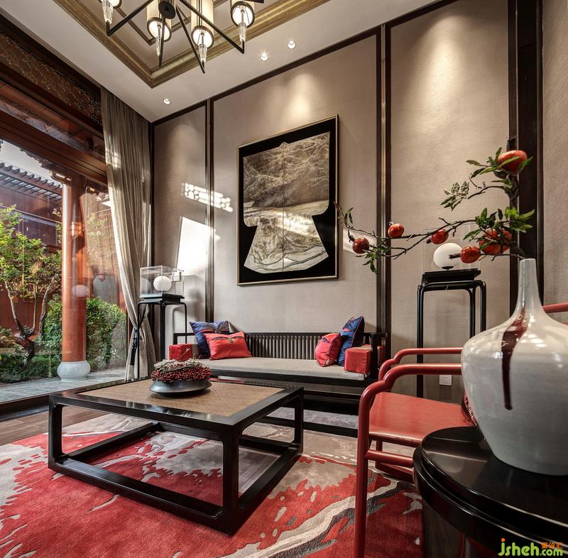 琉璃燈具上流動(dòng)的光影如粼粼水紋,蕩漾在天花,又折落到柔軟的地毯上,四方周正的空間中流淌著靈趣。遵循著古代禮制的家具成序擺放,古沉的灰調(diào)與木色上搭配正統(tǒng)的紅色與黛藍(lán),相得益彰,頗有大家風(fēng)范。
