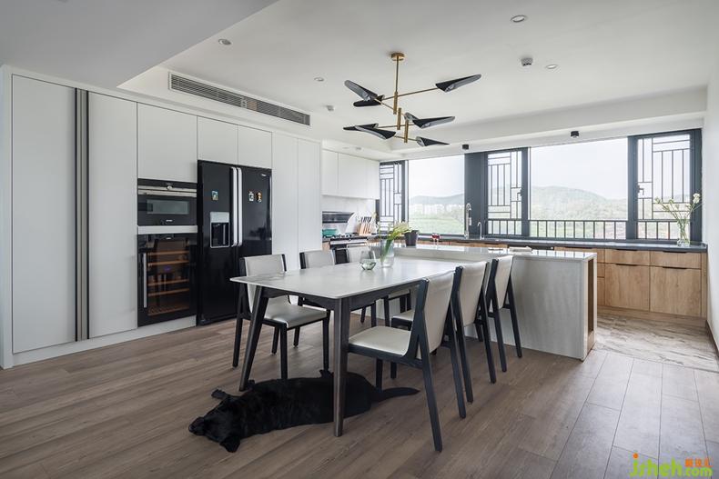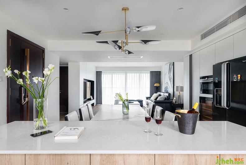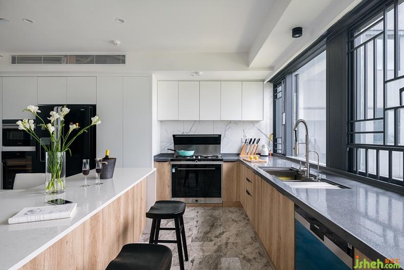 廚房使用木作與石材,借由木頭溫潤樸實的觸感,營造溫暖柔軟空間感,軟硬結(jié)合巧妙,相得益彰。