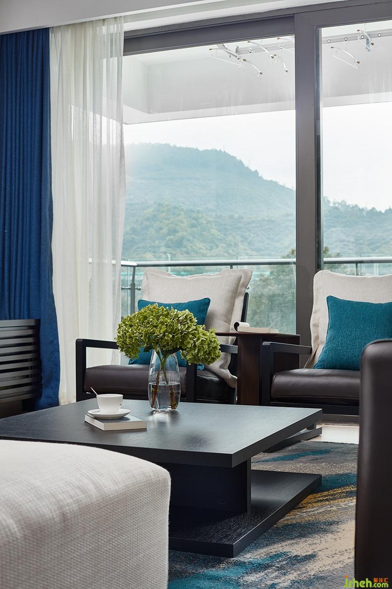屋內(nèi)的一簇綠與屋外翠綠山景遙相呼應(yīng),自成一番頗有深意的意境之美。藍(lán)簾白紗、藍(lán)白腰枕與畫中水霧——藍(lán)與白為空間內(nèi)的一事一物錯落上色,輕松勾勒出空間的層次感。室內(nèi)設(shè)計(jì)師