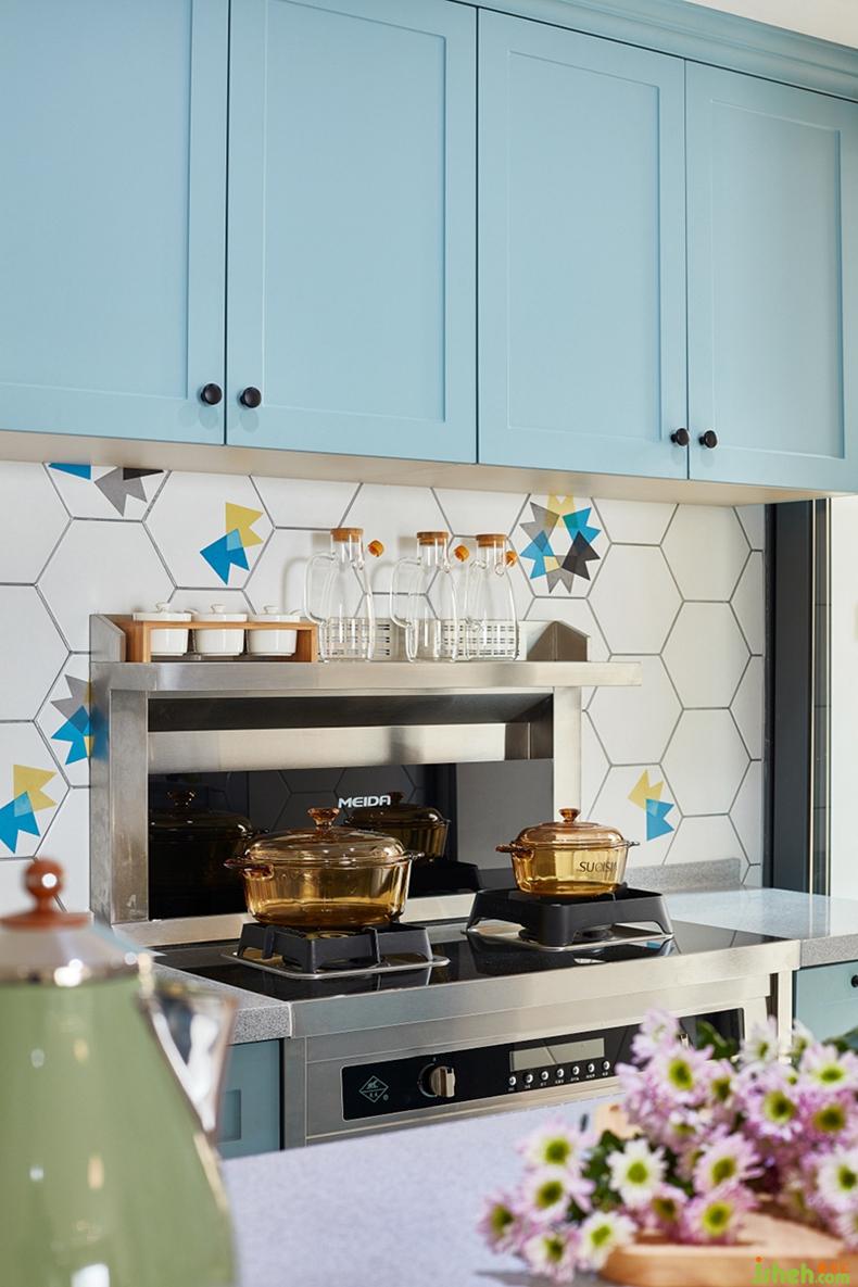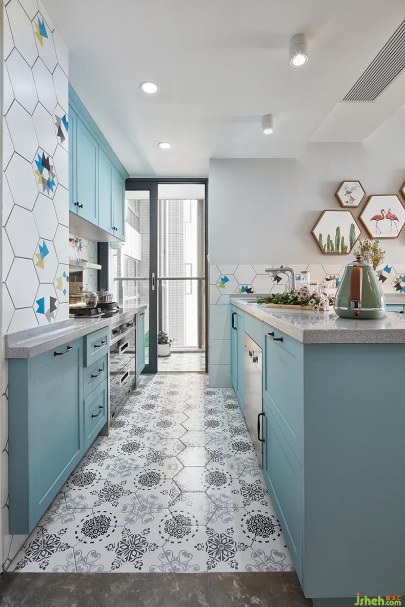 天藍色的運用,讓收納柜頗多的小廚房完全不顯壓抑,明亮且通透。整個廚房既開放也有半隔斷之感,設計師在色系、材料的把控上避重就輕,為小廚房營造出一種“屋外冬日、屋內(nèi)夏日”的清新感。