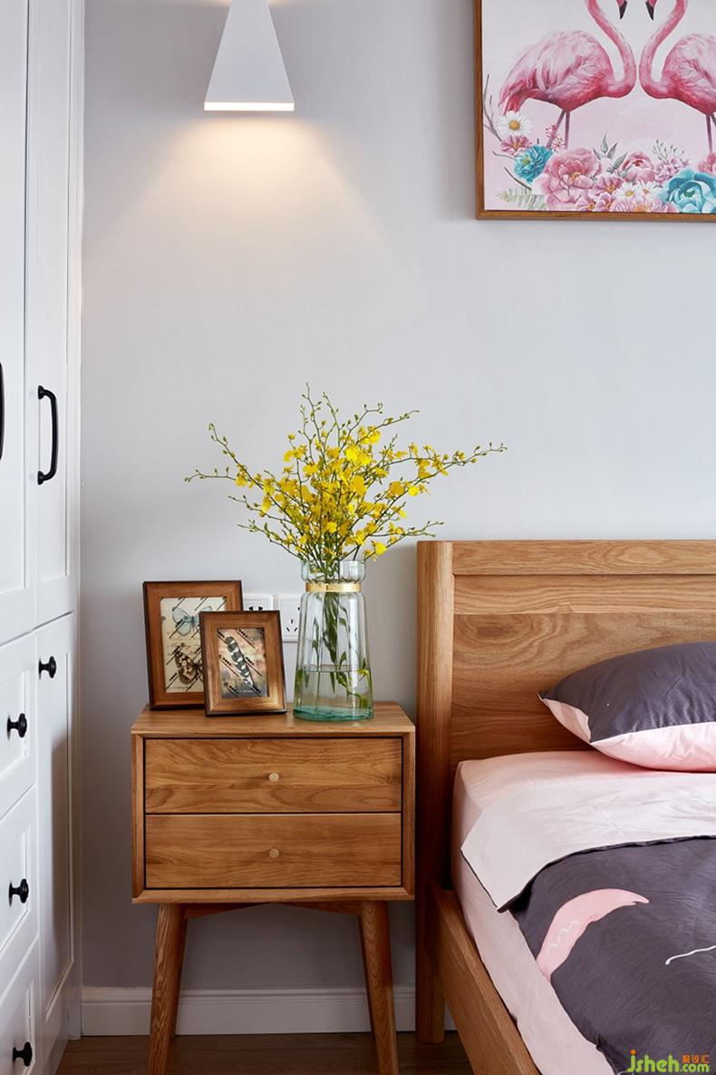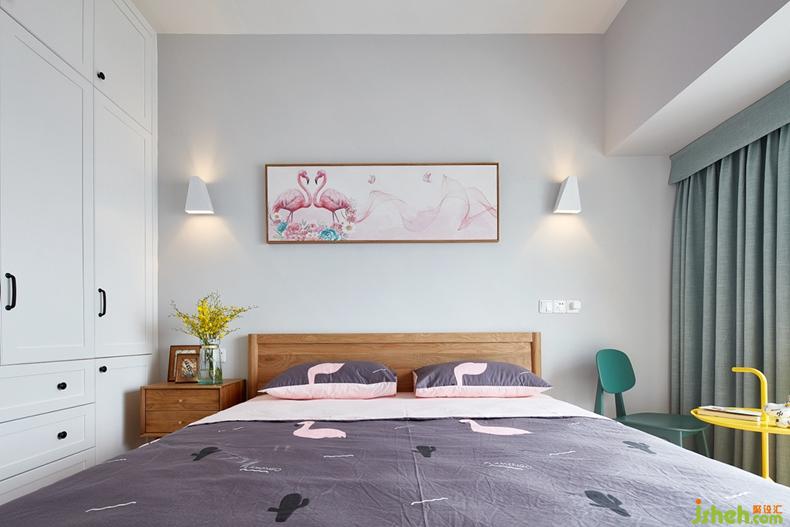 主臥:原木色的舒適、淺粉色的細(xì)膩與粉綠色的清新,搭配調(diào)和著給主臥染上了一抹治愈感?;鹆银B主題的空間自帶浪漫氣息,讓整個(gè)主臥功能性與審美性兼具。
