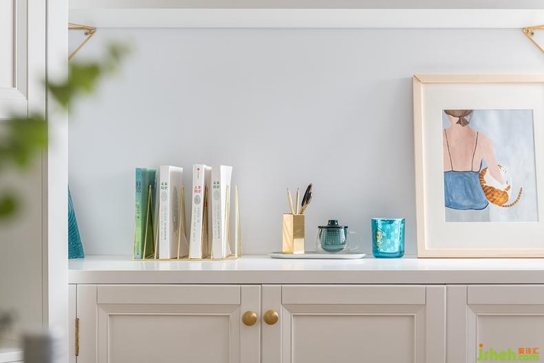 環(huán)壁式書桌將實(shí)用性利用到最大,卡通畫和金色小鹿裝飾調(diào)劑了白墻底色。在天氣晴朗的日子里,坐在窗臺(tái)消磨時(shí)光也是很好的享受。