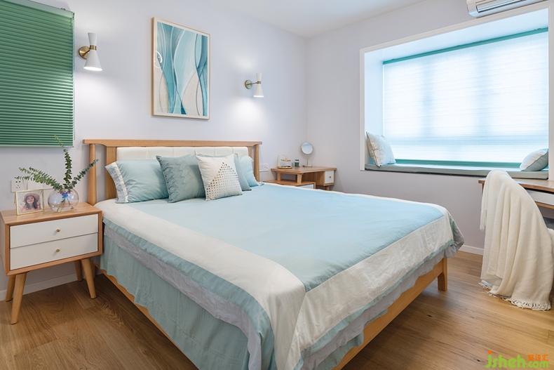玻藍(lán)色的床品與窗簾、裝飾畫的顏色融為一體,這一抹純凈的藍(lán)為臥室披上一層溫暖繾綣的外衣,實(shí)木的肌理,內(nèi)斂的祖母綠,流露著臥室的靜。