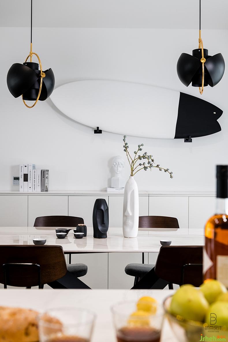 在客廳沙發(fā)背后,吧臺圍合出的小塊區(qū)域,適合朋友們坐下來聊天、閱讀,配合藝術(shù)感極強的燈具和柜子上的書籍,烘托出聚會的氣氛。室內(nèi)設(shè)計師休閑區(qū)既有效地劃分了門廳與客廳的功能區(qū)域,又延伸了視覺效果,可謂是一舉兩得。
